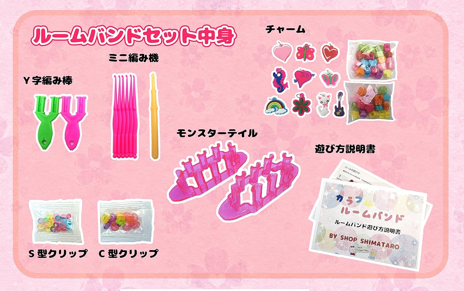 プラスチックピンクで可愛い三段ケースにたっぷりのルームバンドとモンスターテイル2台(小型の編み機)Y字編み棒、中、小のプラスチックフック、可愛いアクセサリーチャームにルームバンド用の穴の大きいビーズ、留め具のカラフルなS、C字フックがセットされたコンプリートセット! 三段ケースなので収納しやすさ抜群です!