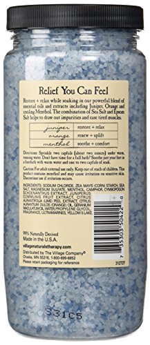 Restore and relax while soaking in our powerful blend of essential oils and extracts including Juniper, Orange and cooling Menthol. The combination of Sea Salt and Epsom Salt help to draw out impurities and ease tired muscles. Our concentrated formula lets you enjoy up to ten relaxing baths with just one jar.The Village Natural Therapy line includes Mineral Bath Soak and Foaming Bath Oil and Body Wash.