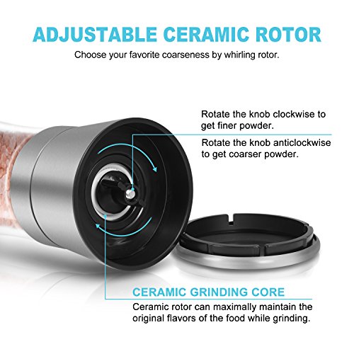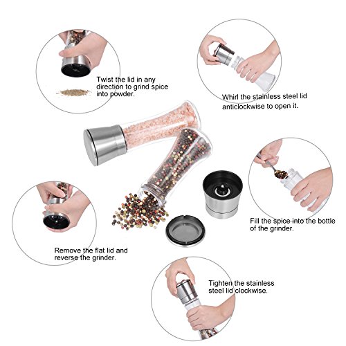 Warm Tips ◆For effortless grinding, please do not fill the shaker too full. ◆For reduce the noise and extend the lifespan, please do not screw the ceramic rotor too tight. ◆Please make sure that the lid has been tightened before grinding to avoid spices spilling. ◆Package only includes two grinders but does not include spices as picture shows.