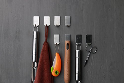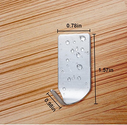 - 4.With a minimalist and engaging design,match nicely with existing stainless hardware in bathroom/kitchen,etc,self adhesive hooks are more convenient and easy to install than the screw into the wall one,no drilling, no tools,no damage to the wall. Just clean the surface, place the hook in your desired location, peel off the backing and press.