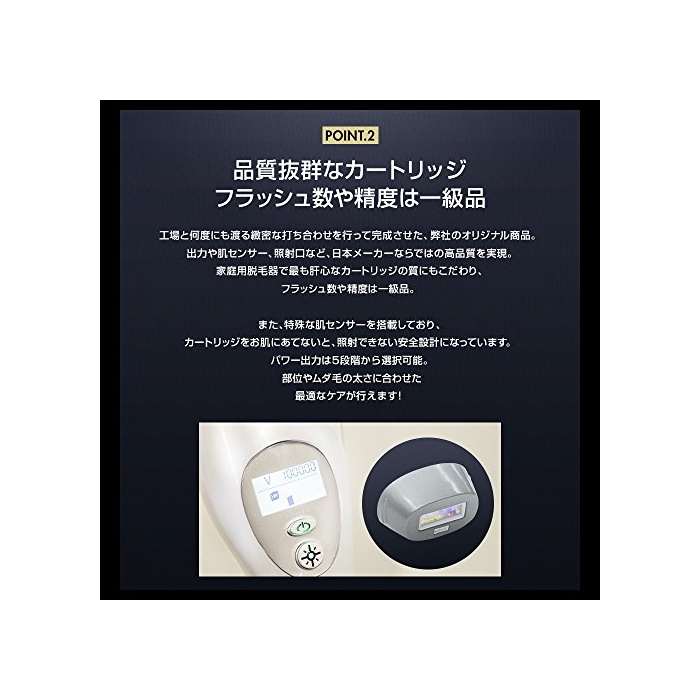 【피부에 친절하게 최적인 케어가 가능!】털의 멜라닌 색소 만으로 플래쉬를 집중 시키는 인 tense 펄스 사이트(IPL)이라고 하는 탈모 기술을 탑재!레이저 탈모와는 차이,피부를 상처 붙이지 않고,쓸모 없는 털 만을 케어 하는 일이 가능합니다.◆카트리지의 질로도 철저히(끝내) (엄선)고집,플래쉬의 수나 정밀도,힘은 일등품!파워 출력은 5단계에서 선택할 수 있습니다.◆겨드랑이 팔각 얼굴 등,전신의 부위나 털의 굵음 에 맞게 했다, 최적인 케어 이 생기는 것도 매력입니다!