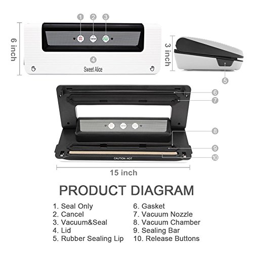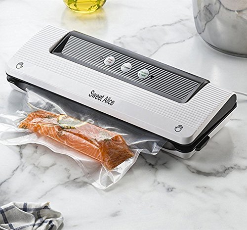 【COMPACT DESIGN BUT POWERFUL,HIGH EFFICIENCY】Sweet Alice vacuum machine is compact, stylish and easy vacuum-to-seal operation with 3 buttons to package several sealed food at one time, more efficeintly. Extra-wide sealing strip creates secure, airtight seal.Sealing Time is about 6~10s. No noise.Easy for storage, save up space in your cupboard.