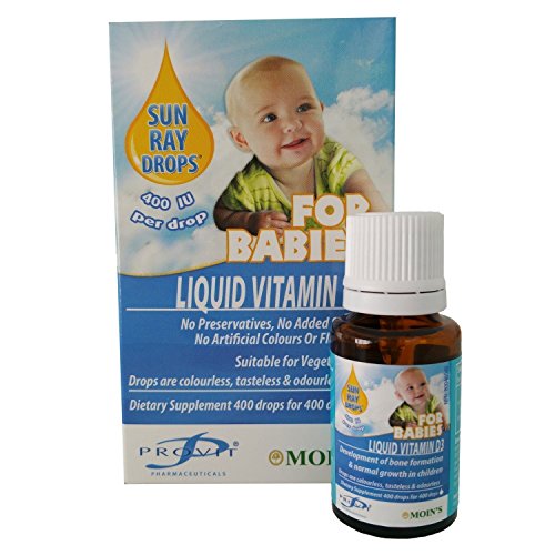 -. Binding : Health and Beauty -. Brand : Moin's -. EAN : 5054515948901 -. Feature : EASY TO USE AND NO DIFFICULT MEASURING: Just 1 drop for 400IU with easy to use dropper dispenser. / HEALTH BOOSTS: Vitamin D supports bone, teeth and muscle development and helps maintain a normal immune function. / PURE LIQUID VITAMIN D 3: No Preservatives, No Added sugar, No Artificial Colours or Flavours. / OVER A YEARS SUPPLY: With 400 drops in each bottle there's no need for frequent reordering. Save time and money. / VITAMINS FOR EVERYONE: Make sure to remember your own Vitamin Supplements too. Search on Amazon for B00W44T2L8 -. IsAdultProduct : 0 -. Label : Moin's -. Manufacturer : Moin's -. MPN : Liquid Sun Ray Drops For Babies -. PackageQuantity : 1 -. PartNumber : Liquid Sun Ray Drops For Babies -. ProductGroup : Health and Beauty -. ProductTypeName : HEALTH_PERSONAL_CARE -. Publisher : Moin's -. Studio : Moin's -. Title : SALE! Moin's Vitamin D3 400iu Liquid Sun Ray Drops For Babies - 400 Drops Per Bottle- Suitable For Vegetarians Ideal For Kids - Benefits Immune System, Helps Strengthen Bones and Teeth- Colourless