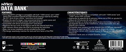 Easily upgrade the PlayStation 4's hard-drive space up to 2TB. The Data Bank for the PlayStation 4 allows the use of a 3.5" hard drive to be used as internal storage instead of the stock 2.5" hard drive that comes pre-installed on the system. 3.5" drives are less expensive at higher capacities than the 2.5" drive inherently supported by the PS4. Typically 3.5" also have a higher read/write speed than 2.5" drives which may slightly improve load times in many games. The unit also includes a front facing LED indicator which illustrates when the PlayStation 4 is accessing or saving content from the hard drive. The Data Bank is powered by a built-in power pass-through cord so it does not require its own power outlet. With Data Bank installed the PS4's internal memory can be expanded up to 2TB, drastically increasing the amount of games and save files that can be saved on the system. Installing the Data Bank is easy and takes only a few minutes. After backing up your saved games simply remove the top cover of the PS4 and the internal 2.5" drive by removing one screw via the included screw driver. Slide the included SATA adapter into place, replace the screw and then snap the Data Bank onto the top of the PS4. Once installed, insert any compatible 3.5" drive into the Data Bank and attach the Data Banks's drive cover. The last step is to plug the Data Bank's power pass-through cord into the PS4 and then plug the PS4's power cord into the Data Bank. Detailed instructions on how to back up and transfer PS4 save files, Data Bank installation and how to initialize the PS4 firmware on a new drive are included in the box. Nyko recommends only using up to 2TB drives at this time as drives larger than 2TB could cause issues with Rest Mode and other features.Feature