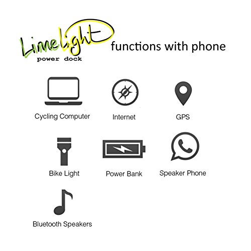-. Binding : Electronics -. Brand : Limelight Power Dock -. Color : Green -. Feature : Bicycle Phone Mount with rechargeable 4400 mAh Li-ion battery to triple any Smartphone battery life. / Bluetooth Speaker and microphone for speakerphone or music playback / Powerful Dual LED lights with two modes / Removable external bell amplified through speakers / Place your phone front and center on your bike for turn by turn directions, or view your bike and fitness apps -. IsAutographed : 0 -. IsMemorabilia : 0 -. Label : Go East Direct -. Manufacturer : Go East Direct -. MPN : Lime-88 -. PackageQuantity : 1 -. PartNumber : Lime-88 -. ProductGroup : Sports -. ProductTypeName : PHONE_ACCESSORY -. Publisher : Go East Direct -. Studio : Go East Direct -. Title : Limelight Power Dock