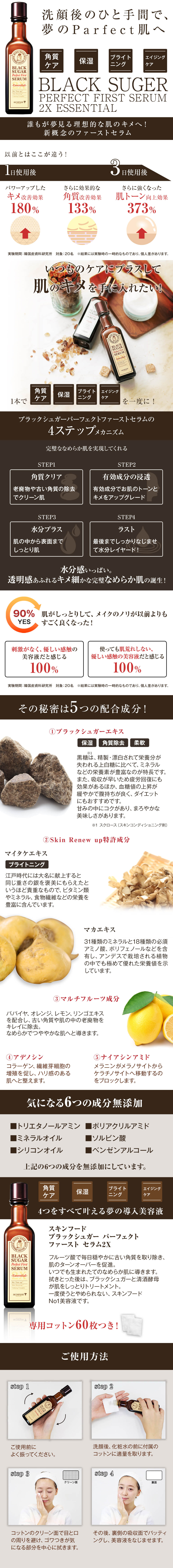 スキンフードのスキンケア部門で、不動のNO.1人気を誇るブラックシュガーパーフェクトファーストセラム。 洗顔後の1分で、角質ケア+エイジングケア※1+ブライトニング※2+保湿のすべてを網羅する、