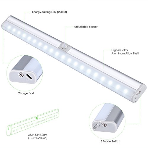 - 【3 MODES & RECHARGEABLE】: Always On, AUTO and Off, 3 working modes motion sensor closet light meet your different needs. Built-in 900mAh rechargeable lithium battery, after fully charge, can last for about 5 hours (Always On Mode) and 1-2 months (Auto Mode--activate 10 times a day). Simply recharge this closet light with included USB cable or any standard USB charger, no need to replace AAA batteries frequently.