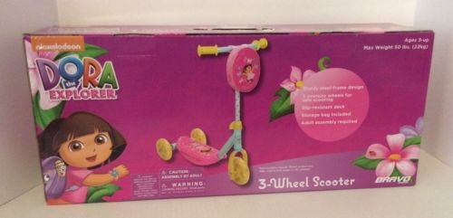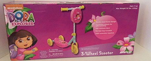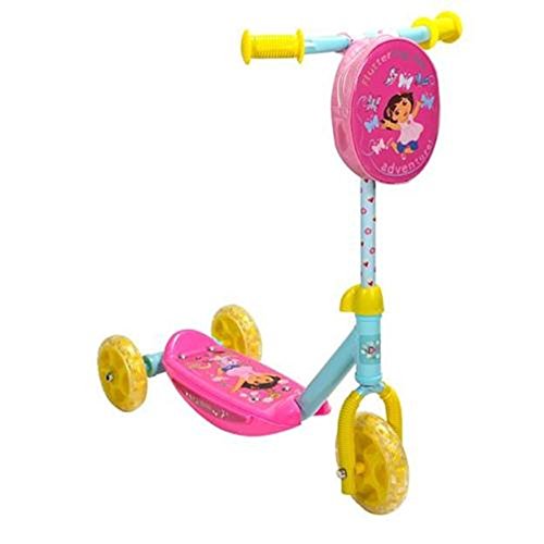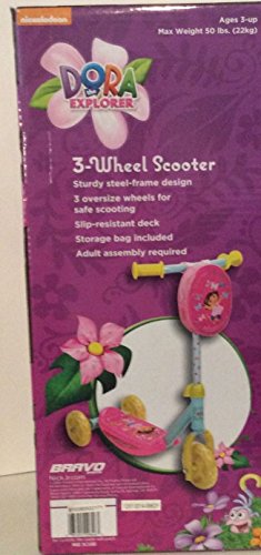 -. Brand : again -. EAN : 7597934580638 -. Feature : The Dora scooter features a pink, light blue and yellow color palette with tri-wheel construction to make balancing easier for your little girl. / A cute pouch with Dora is attached to the handlebars to keep all of your little explorer's treasures possessions safe while she rides. / The Dora Trike Scooter is constructed of a steel frame for strength and durability. / A skid resistant foot plate that is embellished with an adorable pattern keeps your little girl's feet from slipping. / Yellow grips on the handlebars and Yellow PVC tires round out the signature Dora the Explorer 3 Wheel Scooter. -. IsAutographed : 0 -. IsMemorabilia : 0 -. Label : again -. Manufacturer : again -. MPN : again -. PartNumber : again -. ProductGroup : Sports -. ProductTypeName : OUTDOOR_RECREATION_PRODUCT -. Publisher : again -. Studio : again -. Title : Nickelodeon 3 Wheel Scooter Dora The Explorer Pink Blue Ages 3+ (50 Pounds)