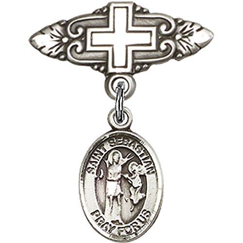 -. Title : Sterling Silver Baby Badge with St. Sebastian Charm and Badge Pin with Cross 1 X 3/4 inches