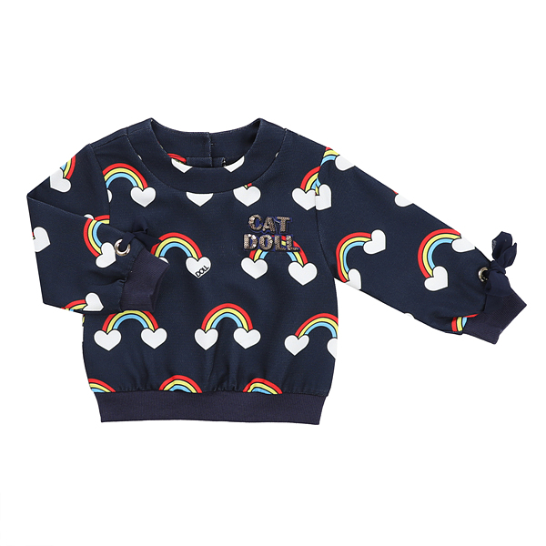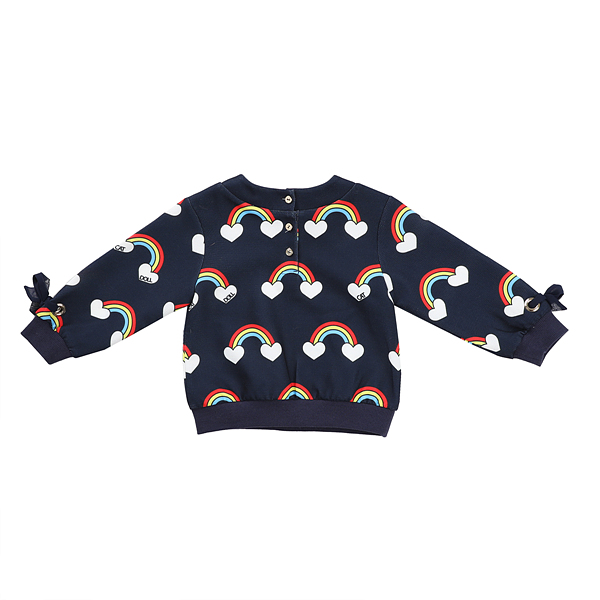 상품설명 네이비 무지개 패턴 MTM입니다. 세트제품인 스커트[Q81DAS050]와 같이 연출하셔도 좋구요. 단독으로 포인트웨어로 착용해주셔도 예뻐요. 소매에 들어간 아일렛과 쉬폰끈 리본이 페미닌해보입니다.