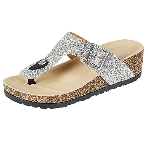 Product DescriptionWomen's Glitter Thong Strap w/ Buckle Cork Sole Slide Wedge Sandal0