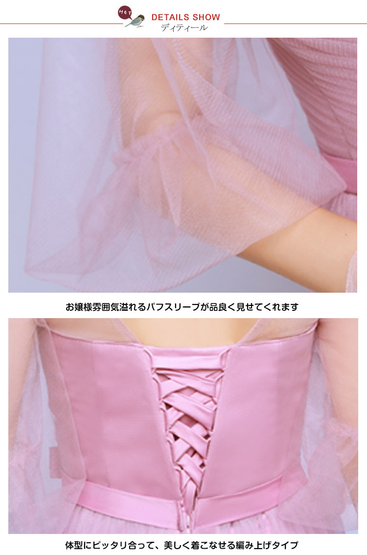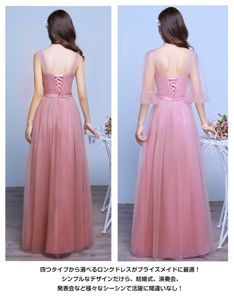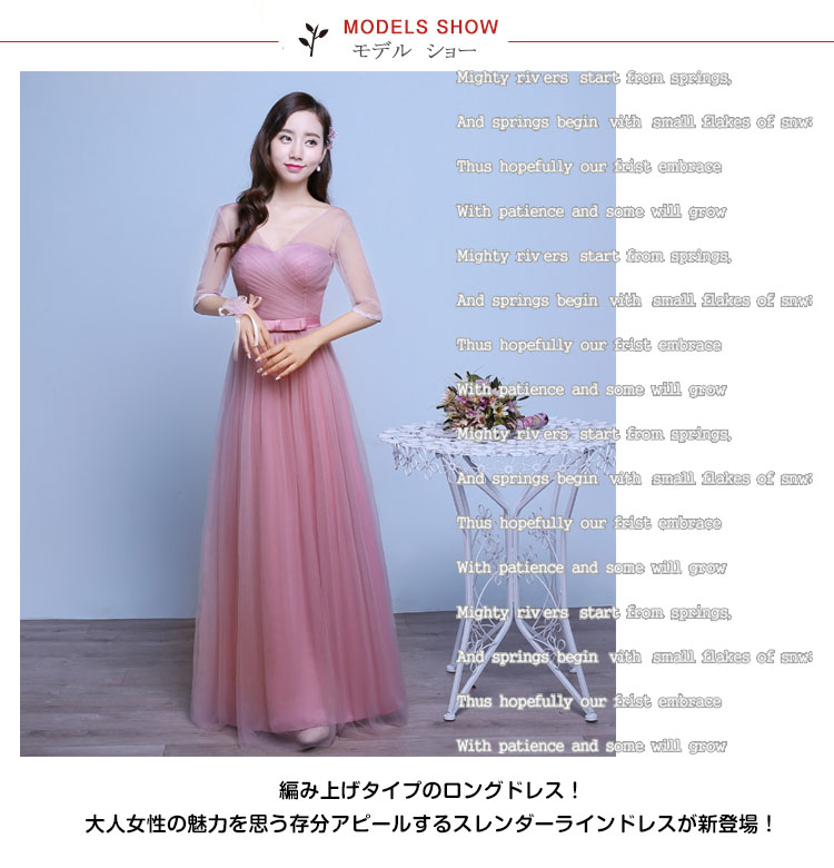 | 編み上げタイプのロングドレス!大人女性の魅力を思う存分アピールするスレンダーラインドレスが新登場!ハイウエストデザインで繊細なチュールロングスカートがまさに大人女性の優雅を演出◎ 体型も完璧にカバー!四つタイプから選べるロングドレスがブライズメイドに最適!シンプルなデザインだけら、結婚式、演奏会、発表会など様々なシーシンで活躍に間違いなし! | |
