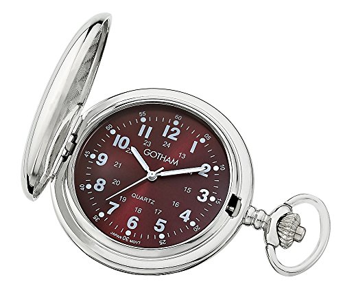-. Feature : Elegant highly polished silver-tone covered hunter case / Rich maroon sun-ray railroad style dial with white Arabic numbers and red 24 hour track / Precision Japanese analog quartz movement / Includes matching 14" curb pocket watch chain with sP.R.Ing ring attachment / Arrives with deluxe draw string pouch and gift box, operating instructions and lifetime limited warranty