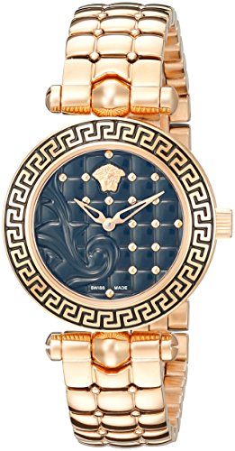 -. Binding : Watch -. Brand : Versace -. Color : Rose Gold -. Department : womens -. EAN : 7630030507342 -. Feature : Ronda 762.3 Swiss quartz movement; rose gold ion-plated stainless steel case / Black dial with baroque pattern in relief and studs; rose gold ion-plated stainless steel quilted bracelet with small studs / Swiss-quartz Movement / Case Diameter: 30mm / Water Resistant To 99 Feet -. Label : First SBF Holding Inc. -. Manufacturer : First SBF Holding Inc. -. Model : VQM050015 -. MPN : VQM050015 -. PackageQuantity : 1 -. PartNumber : VQM050015 -. ProductGroup : Watch -. ProductTypeName : WATCH -. Publisher : First SBF Holding Inc. -. Size : One Size -. Studio : First SBF Holding Inc. -. Title : Versace Women's VQM050015 Vanitas Micro Analog Display Swiss Quartz Gold Watch