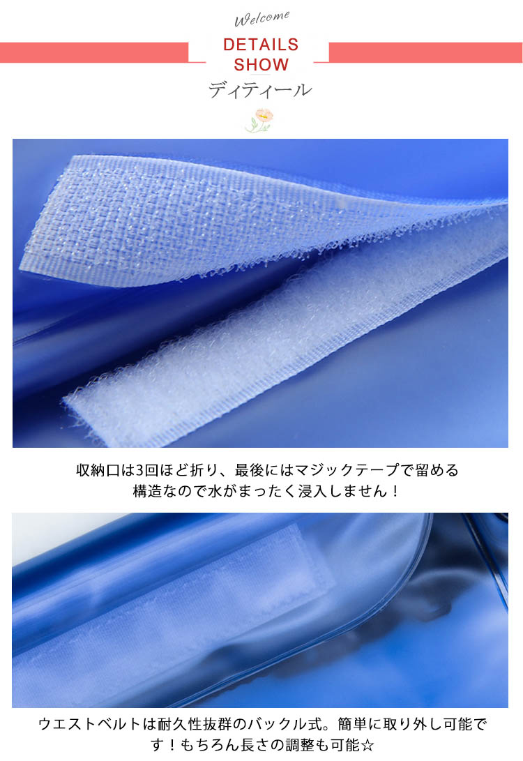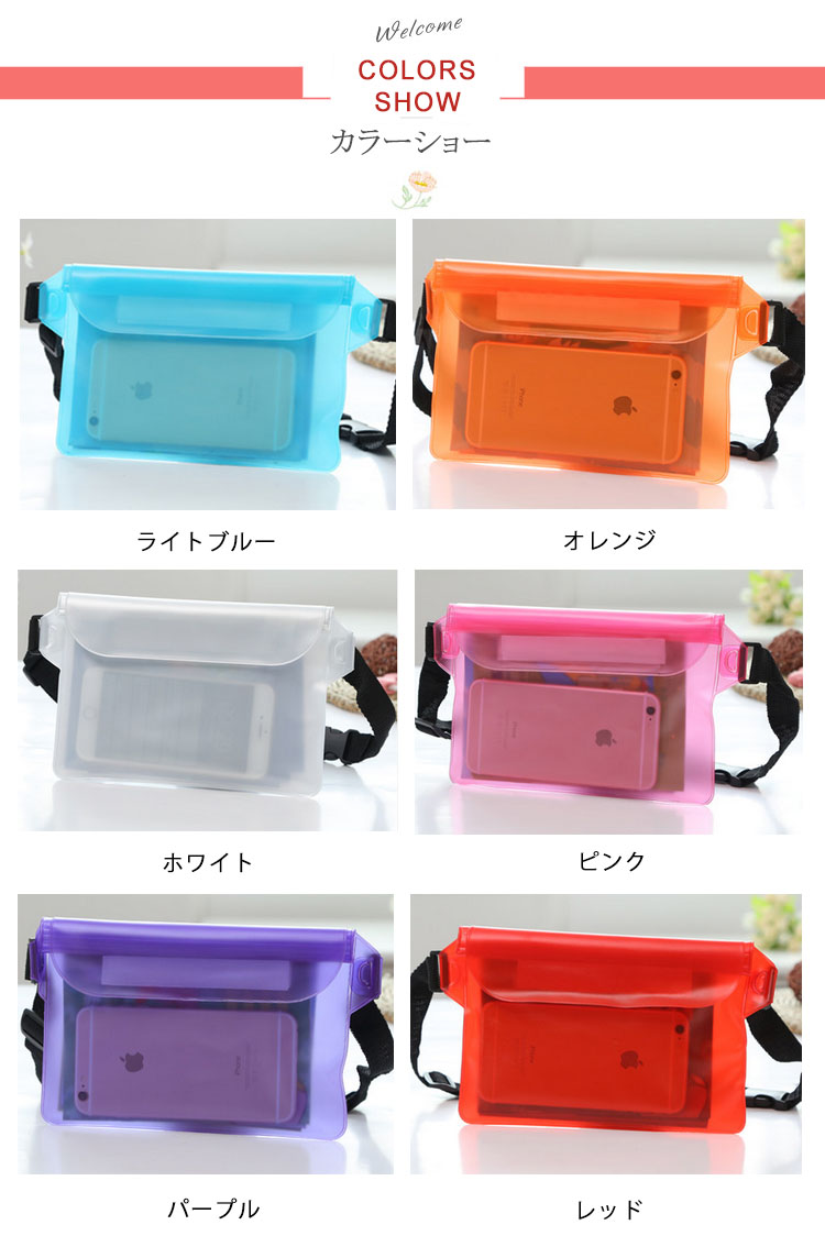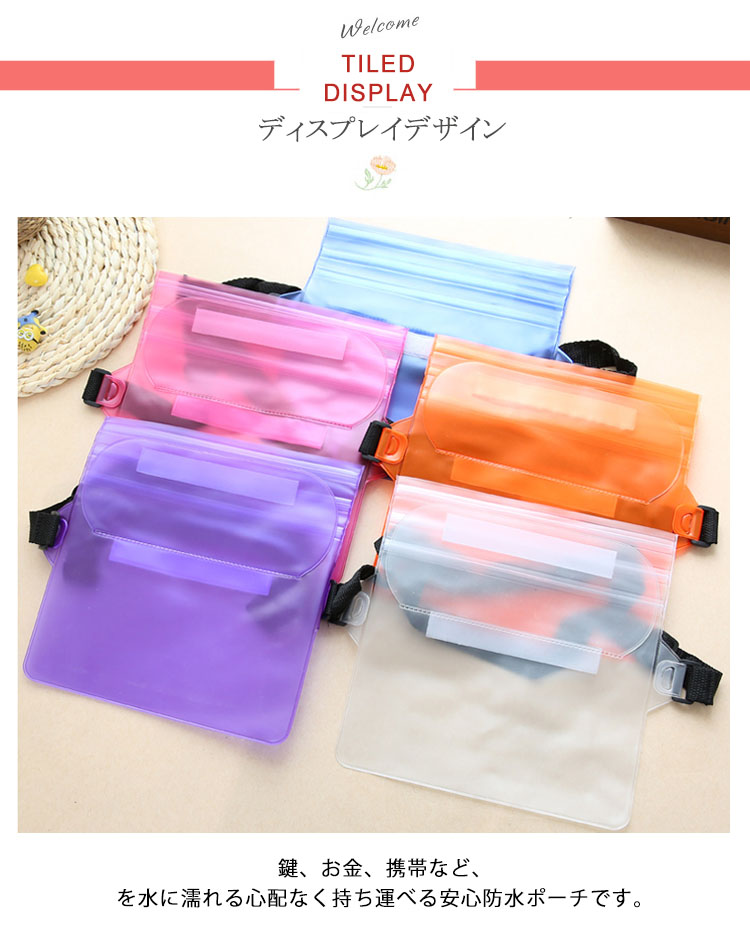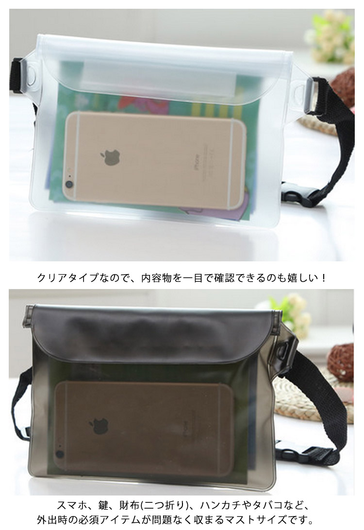 | 鍵、お金、携帯など、を水に濡れる心配なく持ち運べる安心防水ポーチです。マリンスポーツをはじめ、釣り、登山など、いわゆるレジャー活動はもちろん、普段使いのバッグとしても、様々なシーンに便利にお使い頂けます。PVC素材で水に強く、激しい遊びにも耐えられる丈夫な作りです。クリアタイプなので、内容物を一目で確認できるのも嬉しい! | |