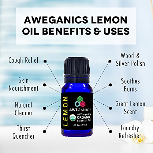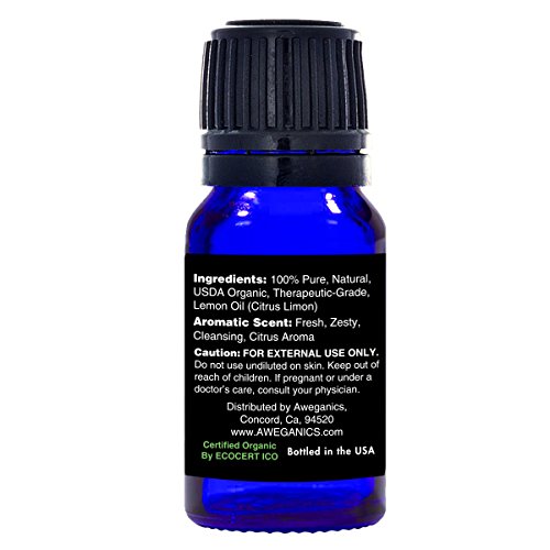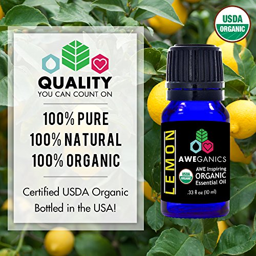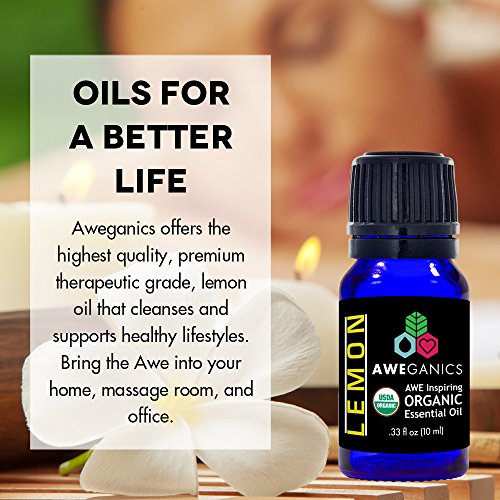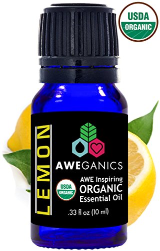 Aweganics Pure Lemon Oil USDA Organic Essential Oils, Premium Citrus Limon 100% Pure Natural Therapeutic-Grade, Best Aromatherapy Scented-Oils for Diffuser, Skin, Face, Bath, Hair 10 ML MSRP $14.99