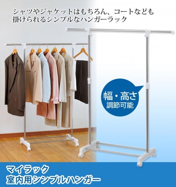 | シャツやジャケットはもちろん、コートなども掛けられるシンプルなハンガーラックです。衣類に合わせて上下と横に伸縮可能。 |
