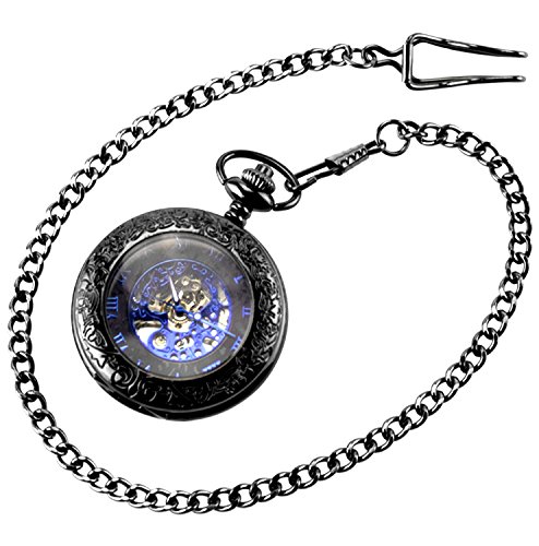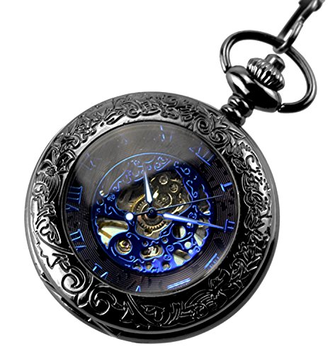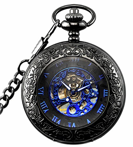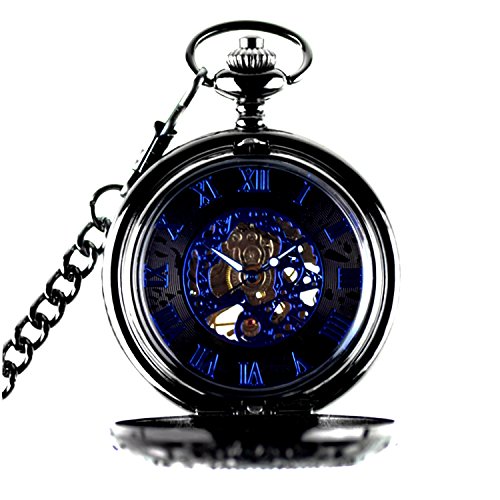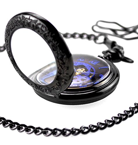 -. Feature : Vintage pocket watch with a black tone metal chain, Black dial with blue roman numerals scale / Vintage transparent alloy case,Luxury blue roman numberal and needles,A nice gift for valentine's day,Hand Wind up operated / Best gift to your lover,Partner, family, friends, classmates, colleagues / Half hunter mechanical Movement,Please wind the clock in the morning every day(you wind it up,it can work for 24hour) / Case diameter:4.7cm,1.5cm thick,Chain Length:37cm,(Comes with gift box)