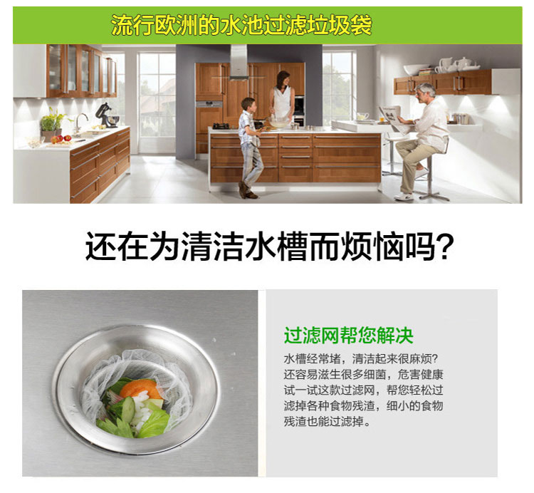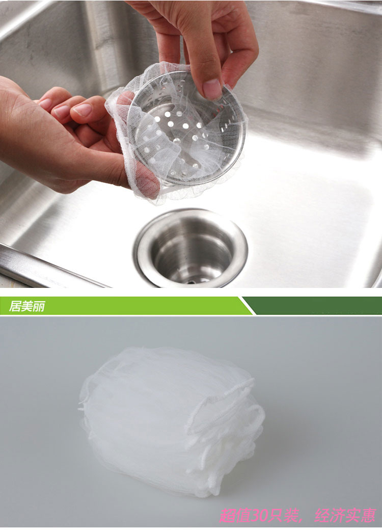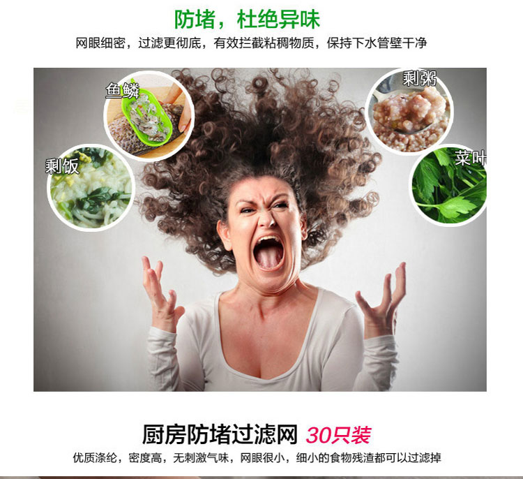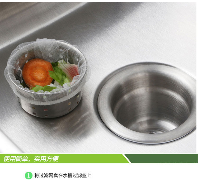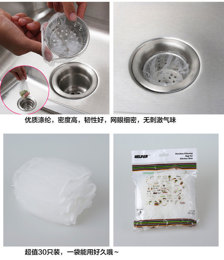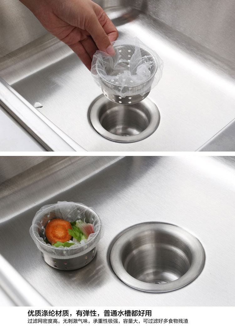 居家实用方便,能有效过滤洗碗后的水池垃圾,防止下水道堵塞产生异味滋生细菌蚊虫,,等,本品采用优质涤纶,密度高韧性好,承重性极强,无刺激气味,网眼细密,能够有效过滤各种食物残渣。