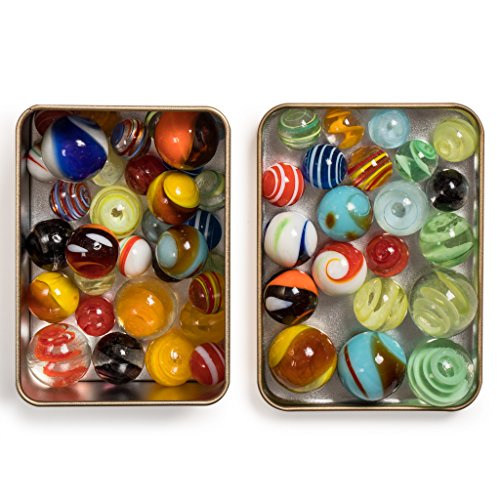- Tin Box Included: A gold, tin box is included for the convenient storage and transport of the complete marbles set.