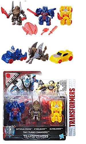 -. Feature : Reveal the Shield Tiny Turbo Changers 3-Pack / Includes 3 iconic heroes featured in Transformers: The Last Knight / Detailed with red reveal camo / Figures convert in 3-4 easy steps / Comes with 8 revealer weapons that uncover hidden images