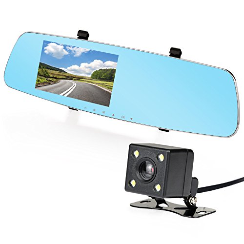 -. Feature : Perfect Dual Lens Integration:With our dual lens car camcorder,your car will have an camera with a front lens and a waterproof rearview lens,5.0 inch rearview anti-dazzling mirror.So you just need to simply bind this product to your original mirror, which will absolutely save your car space and money. / Loop Recording Function: This function ensures continuous recording without missing a second,record automatically during vehicle ignition, switch off automatically with ignition off to get you free from the hands operation. / G-Sensor Function:You can choose the sensitivity freely,when you have an emergency brake, the car camera will automatically save and lock this video.The locked video may help to avoid unnecessary traffic matters. / Parking Guard: When you leave you car and turn on this function,the camera will start up to record and lock the file to save as evidence when your car is shocked by external force collision. / More Features:For better using experience, one more USB port is built in the car charger so that the phone can be also charged when camera is recording. Other features like motion detection, reversing visual function,time setup,and microphone/speaker are also available .All these functions can let you enjoy you car driving on the way safely and comfortably.