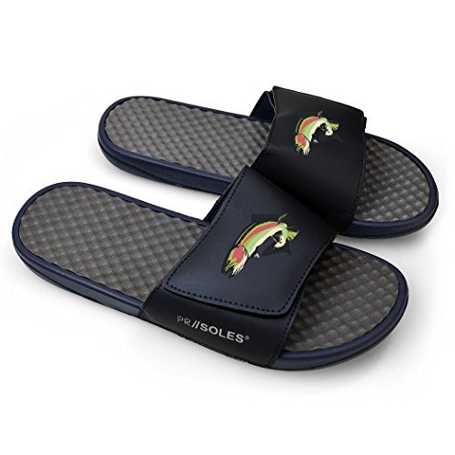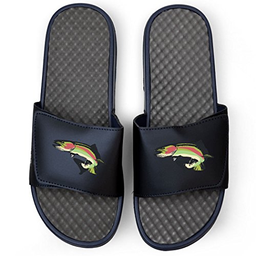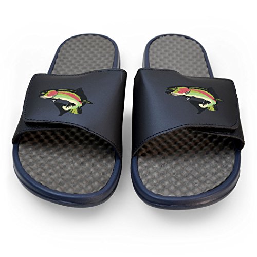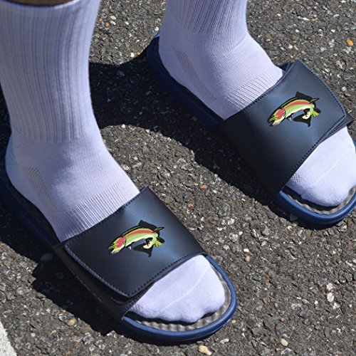 Studio : ChalkTalk SPORTS Publisher : ChalkTalk SPORTS Binding : Apparel Product Description Celebrate fishing for rainbow trout with these navy fly fishing sandals that feature a comfortable gently massaging sole and adjustable VELCRO® strap. Made from sturdy materials, the lightweight slide sandals are a great way to soothe tired feet and are a great pair of everyday slide sandals as well. 0