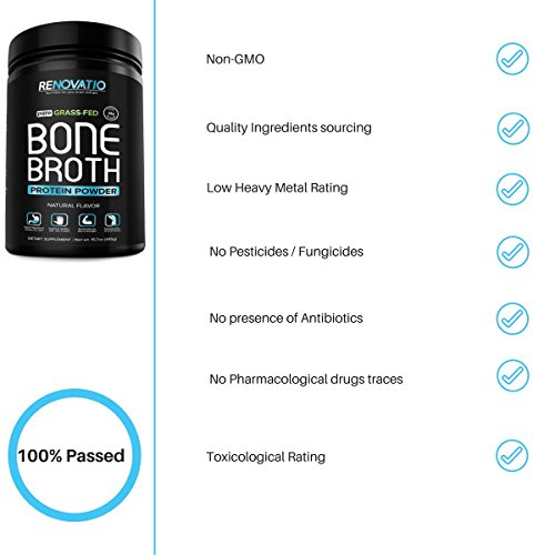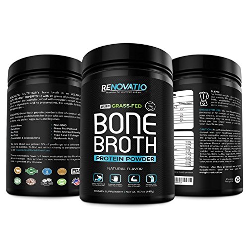 Studio : RENOVATIO NUTRITION LLC Publisher : RENOVATIO NUTRITION LLC Binding : Health and Beauty Product Description ? 5% GOES TO CLEAN OCEANS - RENOVATIO NUTRITION,? through our partnership with the Nonprofit OCEANA - Will provide 5% of all profits to clean our oceans and keep our sea life safe.? Not only are you buying the highest quality products on the market, YOU ARE also HELPING KEEP OUR OCEANS CLEAN. At Renovatio Nutrition we have a deep reverence for time-honored nutrition and responsibly sourced ingredients. And we’ve made it our lasting purpose to share bone broth’s rich history with a new generation. The more things change, the more they stay the same. Your grandma probably made a variation of bone broth in her kitchen. But just because many of us lack the time to prepare a proper bone broth, we’re no less appreciative of its healthy, velvety goodness and zesty nourishment. How to use? Simply mix 1 scoop of Bone Broth Protein Powder in 12 oz of? your favorite healthy drink and mix with a blender.?? OUR GUARANTEE: Our product is FREE of potentially hazardous contaminants, including antibiotics, growth hormones, artificial?flavors, prescription drug metabolites, steroids, and insecticides. It's also Non-GMO, Gluten Free, Soy Free, Dairy Free and Nut-Free! With a trusted brand like?RENOVATIO NUTRITION you are GUARANTEED the highest quality Bone Broth from pure, pasture-raised, grass-fed cows. 0 |