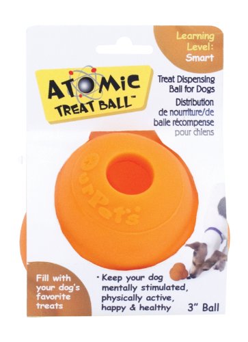 What better way to keep your dog mentally stimulated, physically active, happy, and healthy than with a toy that dispenses his favorite treats? Fill the Atomic Treat Ball with kibble or treats and watch as your dog rolls and nudges the ball to get the tasty morsels inside. Available in 3” and 5” sizes.