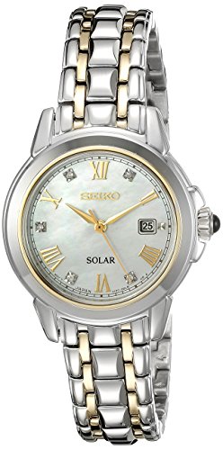 Stainless steel case with a two-tone (silver and gold-tone) stainless steel bracelet. Fixed two-tone bezel. Mother of pearl dial with silver-tone hands and alternating Roman numeral and diamond hour markers. Minute markers around the outer rim. Dial Type: Analog. Date display at the 3 o'clock position. Quartz movement. Scratch resistant Hardlex crystal. Pull / push crown set with a cabochon. Solid case back. Case diameter: 28 mm. Case thickness: 9 mm. Round case shape. Band width: 12 mm. Push button clasp. Water resistant at 100 meters / 330 feet. Functions: date, hour, minute, second. Casual watch style. Seiko Solar Le Grand Mother of Pearl Dial Two-tone Ladies Watch SUT244.Feature