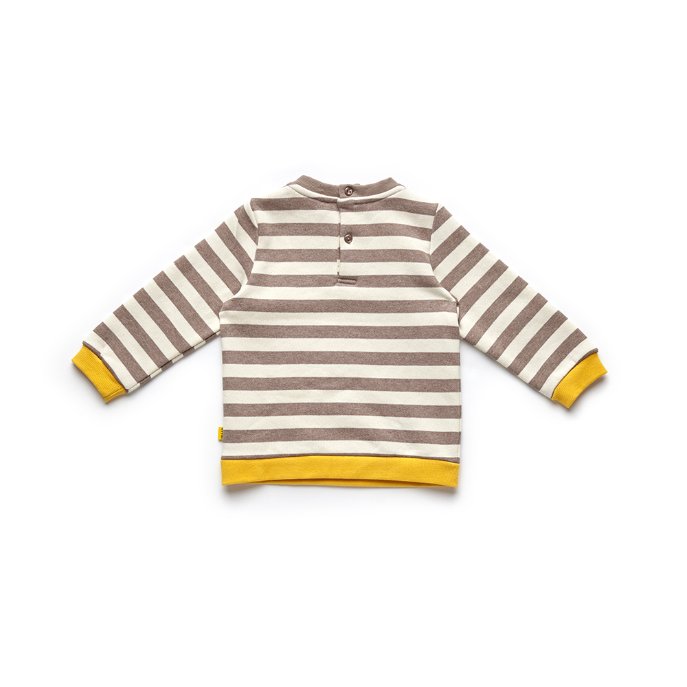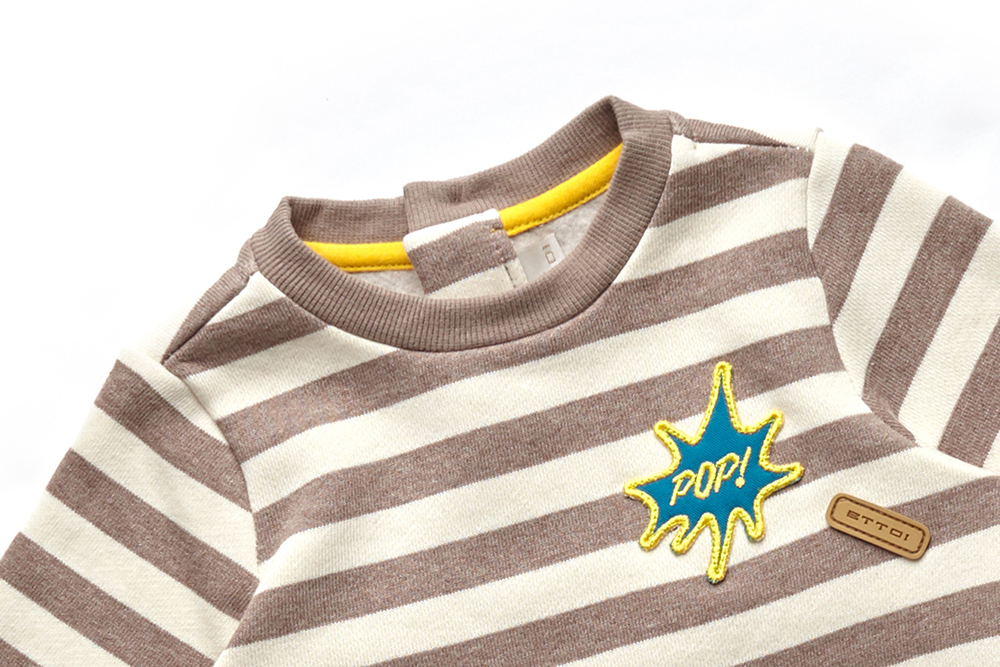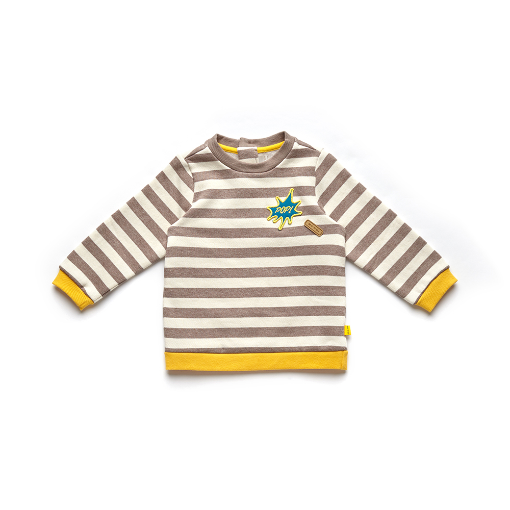 ■ 상세설명 : 따듯한 브라운 스트라이프원단과 옐로우 컬러로 포인트를 준 맨투맨 티셔츠입니다.
