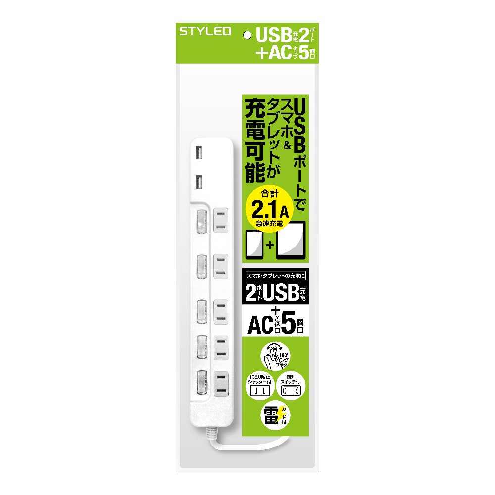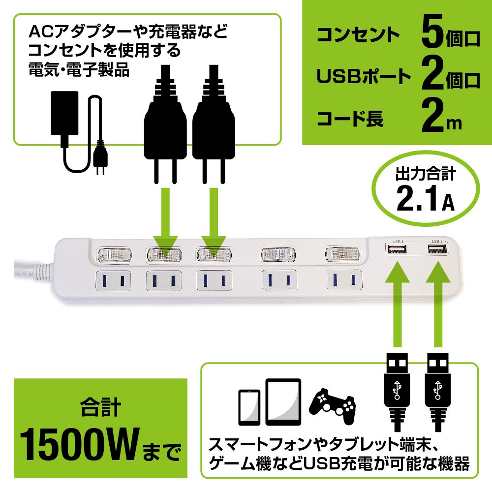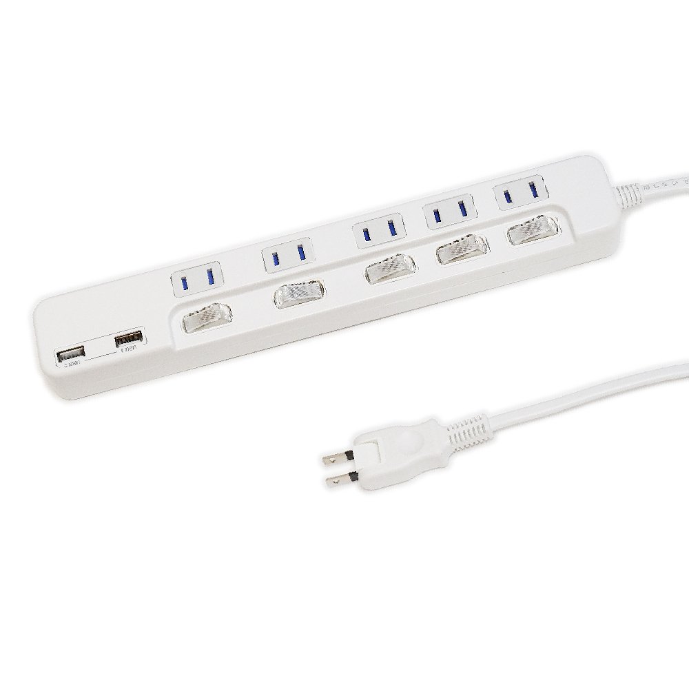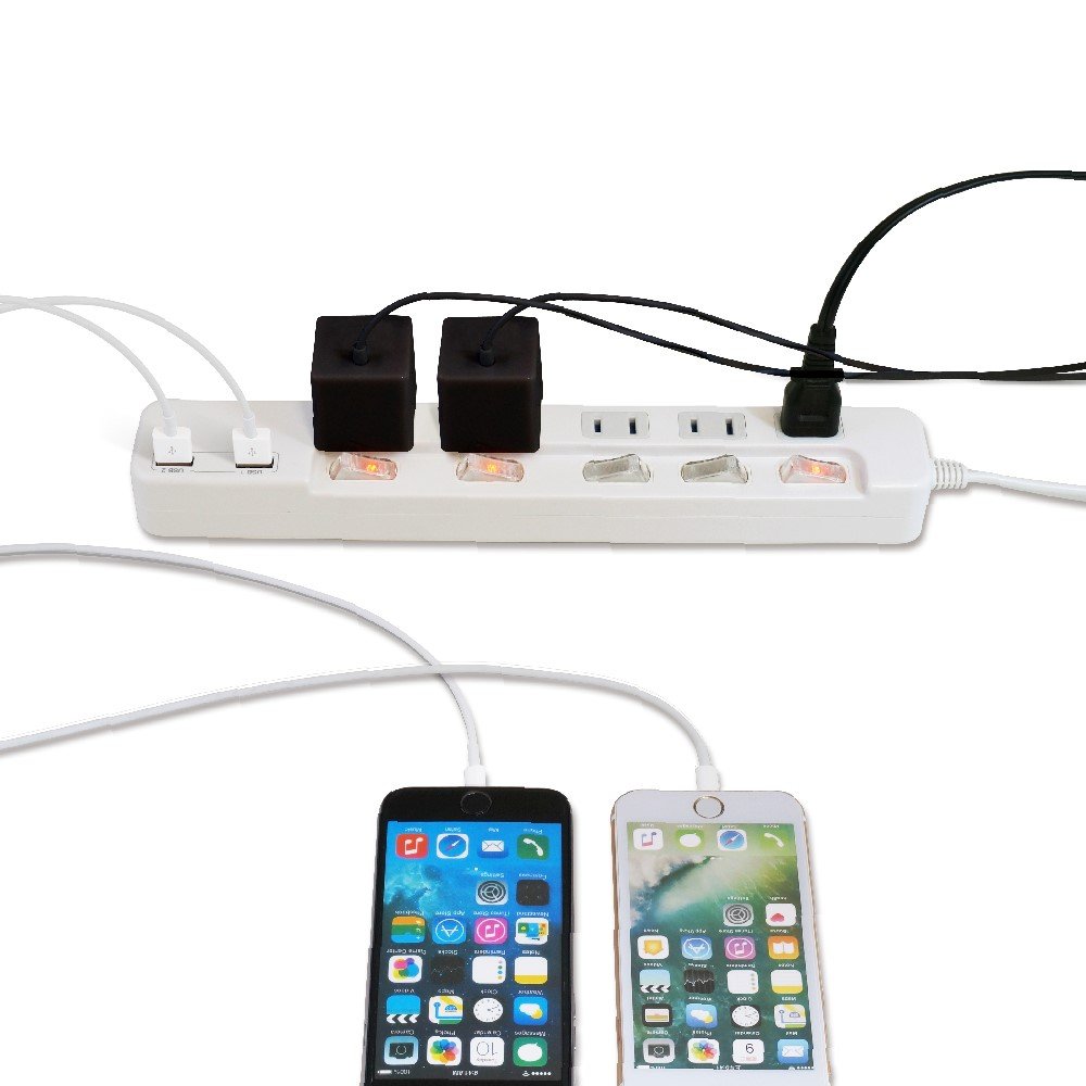 Equipped with 5 power outlets and 2 USB ports