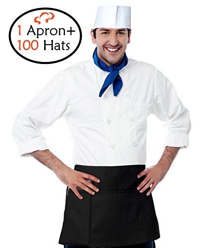 - - Chef Set Includes- 1 Waist Apron with Pockets and 100 Disposable 3 inch Chef Hats