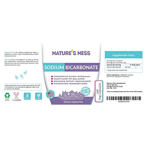 Natures Ness Sodium Bicarbonate Comes in Vegetarian Capsules. These Are Not In Sodium Bicarbonate Tablets. The Sodium Bicarbonate Powder Is Put In Capsules. Sodium Bicarbonate Helps with Digestive Issues. Sodium Bicarbonate Also Known As Baking Soda Powder Is Known To Maintain A Healthy PH Level. PH Balance Diet Has Become Very Popular. Natures Ness Sodium Bicarbonate Works Well With Our PH Balance Test Strips. Balance Your PH! PH Balance For Women Is Very Important. Capsules Also Act As A Natural Antacid. Similar to Antacid Tablets, Antacid Chews, And Antacid Liquid. Our Capsules Act As A Sugar Free Antacid. Antacid Helps Natural Heartburn Relief. Heartburn Relief Is Painful, Heartburn Medicine Always Helps. Sodium Bicarbonate Is Here To Save The Day. Helps People With Interstitial Cystitis. Helps Sensitive Stomach Acid. Also Works With The Renal Diet. Sodium Bicarbonate Reduces Stomach Acid. It Is Just Like A Baking Soda Tablet But It Is A Baking Soda Capsule. We Take Baking Soda And Fill Up A Capsule, Creating A Baking Soda Capsule. Perfect For People Who Follow PH Balance Diet, Use PH Balanced Soap ,PH Balance Strips, PH Balanced Shampoo, PH Balanced Tampons, and PH Balance Pills. Sodium Bicarb Short For Sodium Bicarbonate. Try Our Aluminum Free Sodium Bicarbonate And You Will Feel Acid Free. Helps With Yeast Infections. This Is a Yeast Infection Treatment And Yeast Infection Pill. It is used as an antacid to treat heartburn, indigestion, and upset stomach. Sodium bicarbonate is a very quick-acting antacid. This product is the only Sodium Bicarbonate in capsule form on the market. Nora Ephron And Dr. Mark Sircus Wrote About The Powerful Sodium Bicarbonate.Feature