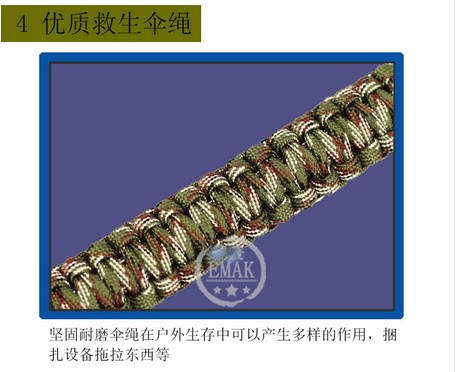 所用的材料都是伞绳特用、与海船用的绳子一样,具有耐腐蚀、抗老化等优点。有时候一根绳子可能就是您的一条生命。