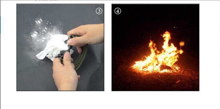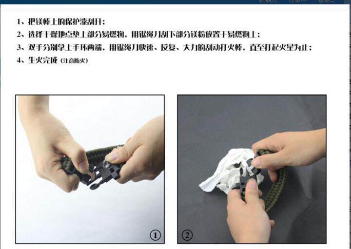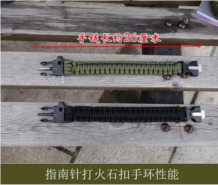这不是一款普通的伞绳手链,它具有更多户外求生功能。它配备了户外救生取火石,高精度迷你指南针,切绳刀,求生口哨和一根长约3米的7芯伞绳,为您的户外探索提供安全保障。