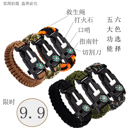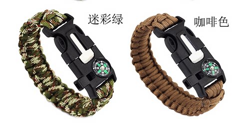 这不是一款普通的手链,它具有更多户外求生功能。它配备了户外救生取火石,高精度迷你指南针,切绳刀,求生口哨和一根长约2.5米的7芯伞绳,当然您可能更需要一款可以调节尺寸的手链。为您的户外探索提供安全保障。
