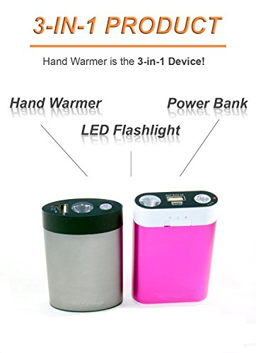 -. Feature : KEEP YOUR HANDS WARM: You will LOVE the double sided Hand Warmer heats up you hand and fingers. Choose the optimum heat setting for your comfort: Warm (44 degrees) or High heat (up to 50 degrees). The heat lasts about 3 to 5 hours. Smooth to the touch. / 3-IN-1 PRODUCT: The Hand Warmer is the 3-in-1 Device. Perfect for Outdoor Activities such as Camping, Golf, Hunting, Hiking, Skiing, Fishing, Commuting to Work, visiting sports events and more! This is the ideal solution to keep the adventure going on in any weather! You will not be suffering from cold hands! Hand Warmer, LED Flashlight & Power Bank / BE IN TOUCH, CHARGE TO GO: As a today's world must-have, the Hand Warmer, will make sure that you have warm hands and enough battery power for the long day. It will keep your phone or other devices charged and will not let you miss an important call or message. Compatible with iPhone 7 Plus 6/ 6s plus 5s/ 5/ 4s/ 4, iPod, Samsung devices Galaxy s7/ s6/ s5/Edge, HTC phones, tablet, digital GoPro cameras, portable game consoles and MP3/MP4 players, kindle, etc. / SAFETY & LED LIGHT: ROHS, CE & FCC Certified. Build-in 4400mAh lithium polymer battery with 500+ Recharge Cycles. Maximum-security provided: short-circuit and overcurrent protection. You will never be in the dark thanks to the built-in LED flashlight, which is also great as an emergency light source.