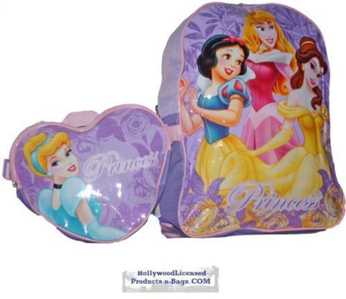 Disney Princess Large Backpack with Free Bag. Constructed of 600 denier polyester. The dimensions are 15 inches x 11 inches x 5 inches.