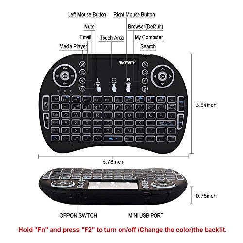 Backlight wireless keyboard: mini touchpad keypad remote is with backlights of 3 colors. The backlights are evenly distributed on the wireless keyboard and very easy to see at night or in a theater room