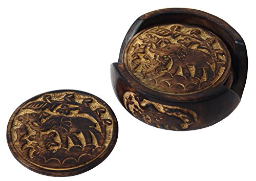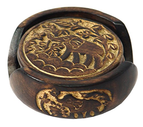 Elegant Antique Look Hand Carved Wooden Coasters Set of 4 with Holder Elephant Trunk-up Floral Wood Carving