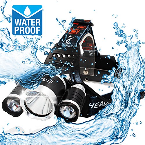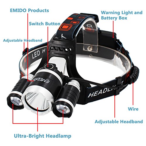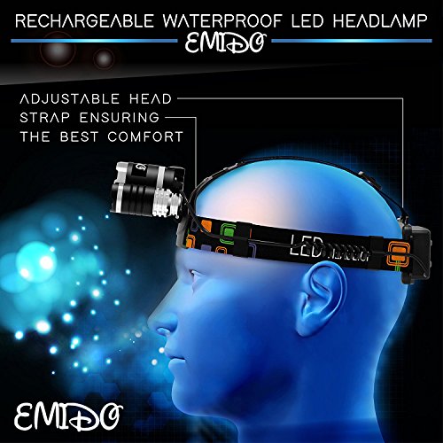 EMIDO Brightest LED Headlamp, 4 Modes Waterproof LED Flashlight, 18650 Rechargeable Batteries Headlight Hard Hat Light Head Torch, for Reading Outdoor Running Camping Fishing Walking Hiking Riding
