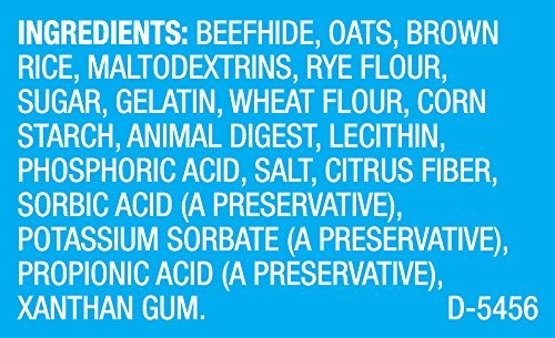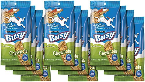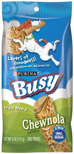 -. Feature : Twelve (12) 4-Ounce Pouches of Busy Chewnola Dog Treats / The Chew Made with Beefhide, Oats and Brown Rice--Three Layers of Goodness to Feel Good About as Your Dog Gets Lost in the Fun! / Long-Lasting for an Exciting Treat Time to Lick, Savor and Chew / The Perfect Size for Small/Medium Dogs / Feed Only as a Treat to Your Adult Dog. (See back panel for feeding instructions)