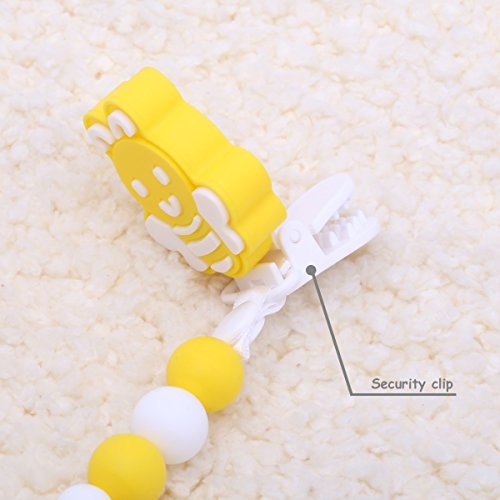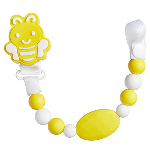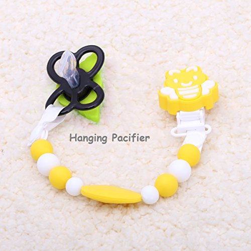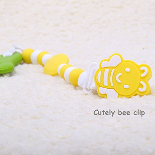-. Feature : MULTI-FUNCTIONAL :Lovely bee pattern to attract baby's attention,this baby pacifier clip not only to prevent the loss of pacifiers and teethers,but also can be used as a teether directly. / SAFE AND NON TOXIC: The soothie pacifier clip is non-toxic and BPA-free,passed the FDA /CPSC certification, 100% food-grade silicone material, has no taste or smell. / HIGH QUALITY: The soothie pacifier clip is made of food grade silicone,soft texture, baby can bite and chew it. You can attach it on baby's clothes or anywhere you need,once you snap it closed,even if you pulled on the clip hard, it would not come off. / EASY TO CLEAN AND DRY QUIKLY: Simply clean with hot water or disinfectant wipes, the silicone pacifier clip is very easy to dry, equipped with special cloth bag, making the silicone pacifier clip more portable. / BEST GIFT FOR BABIES: The soothie pacifier clip can help your baby to relieve discomfort during teething and help baby's teeth grow healthily, it is the best gift for your babies.
