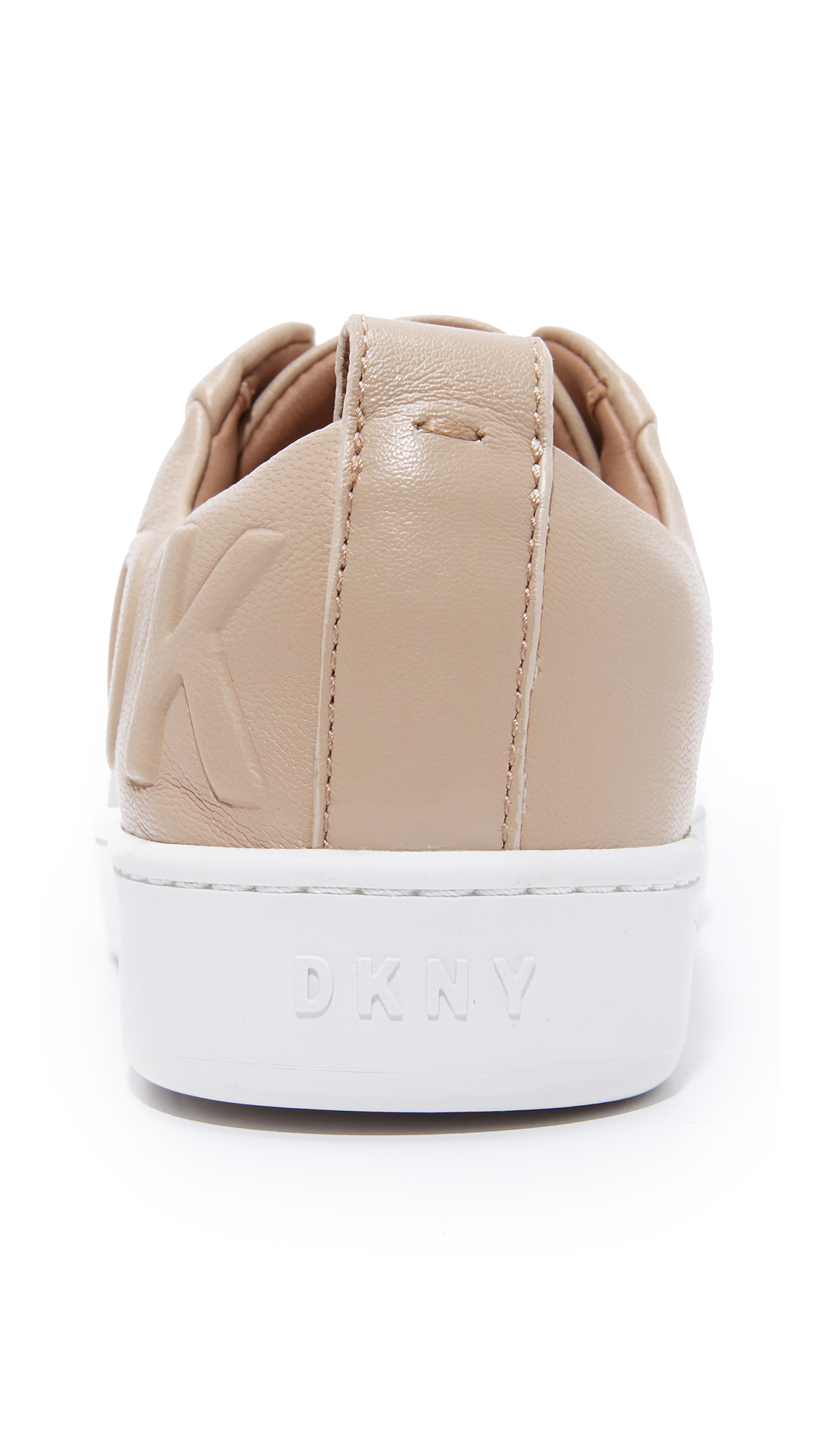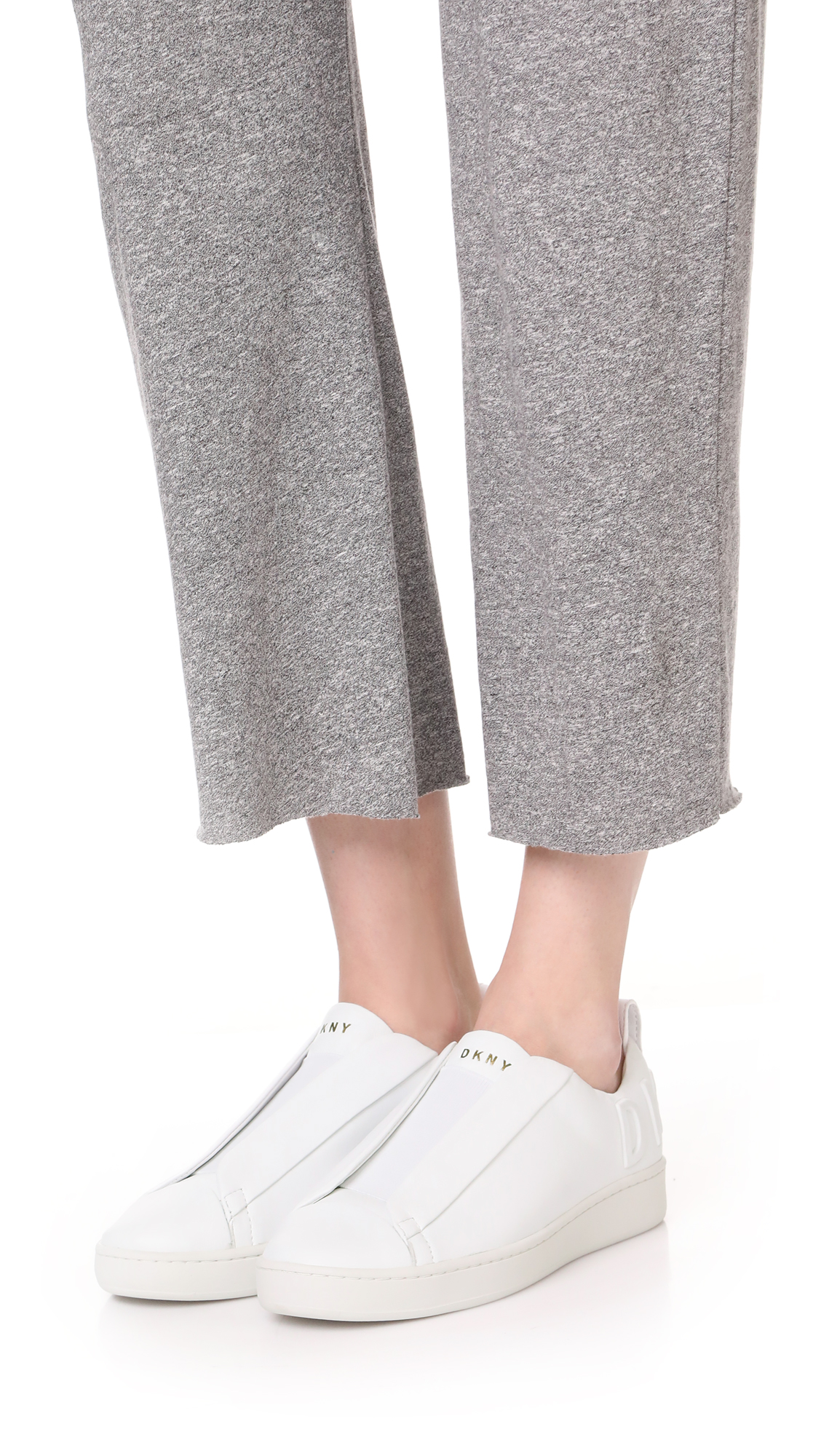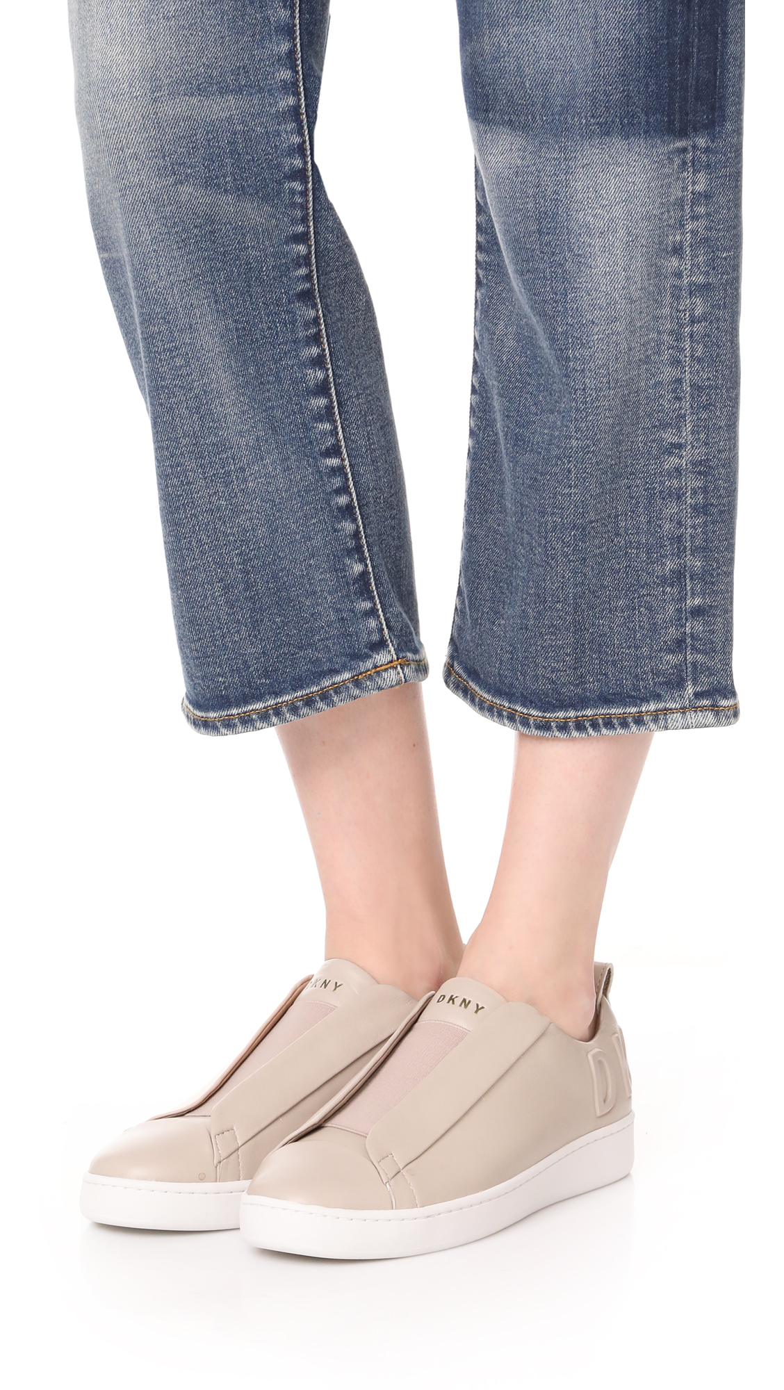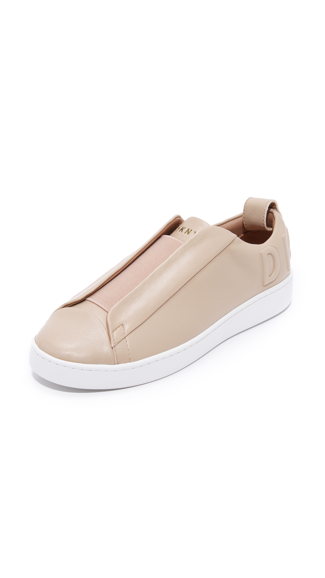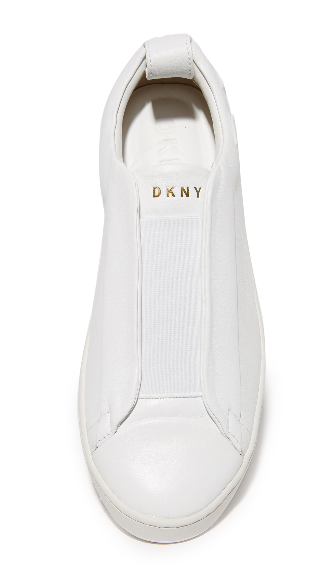 Smooth leather DKNY slip-on sneakers with debossed logo lettering at the heel. Elastic trim at tongue. Pull-tab at heel. Rubber sole.Leather: Sheepskin.Imported, China.This item cannot be gift-boxed.