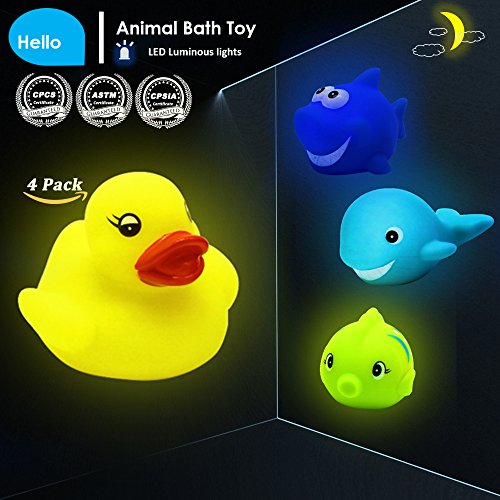 Studio : COOLEER Publisher : COOLEER Binding : Toy Product Description Ocean Bath Toy - Make your baby love bathing. About us: Our company aims to provide customers a easier and comfortable lifestyle. Description 100% brand new and high quality. Set of 4 packs, including Fish, Duck, Shark and Dolphin . Size about Duck:6X6X4.5cm, Dolphin:7.5*5.8*4.5cm, Fish:5.7*4.2*4cm, Shark:6.5*5.5*5cm. Perfect size for little hands. Durable, funny, non-toxic vinyl bath toys. These ocean animal bath toys are suitable for toddlers of all ages to enjoy bath time fun. These funny toys can float on the water because they are made of Non-toxic rubber which is soft and lightweight. 4 different colors help to teach babies to distinguish colors. To make learning consist in everywhere. The light of bath toy attaches kids' attention to increase the interactions between your babies and you, which will promote mutual feelings. These little toys floats on the water and it stays flashing as long as its floating. It can also flash if the contacts on the bottom are touched and then it will turn off after 18-20 seconds if its not in water and the contacts are no longer touched. When it flashes it scrolls between the red, blue and yellow colors and mixes the colors. Its very ducky and cute. Warning: Recommended age is 3 YEARS , If you would like to buy these for little kids or baby, please make sure that to be used under adults supervisor. No sharp edge won't hurt your children.
