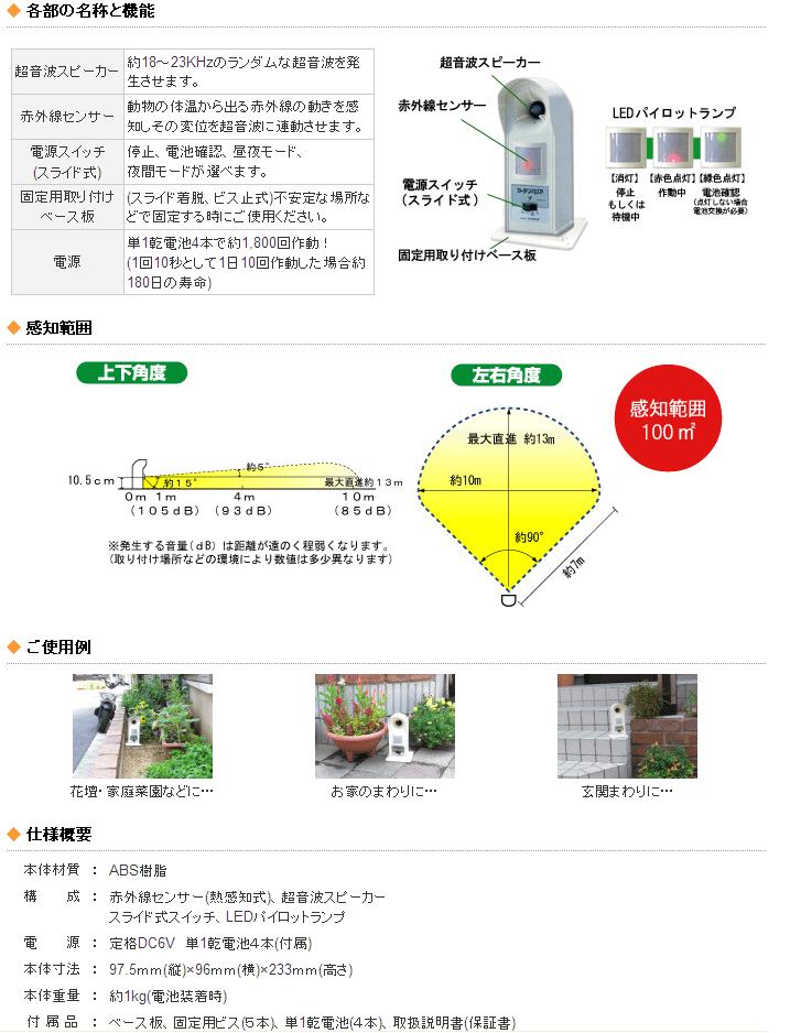 ●猫の動きと連動した不規則な周波数を用いることによって猫が超音波に慣れるのを防ぐようになっています。