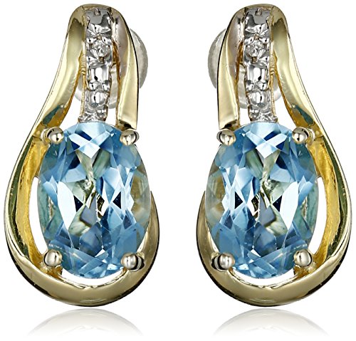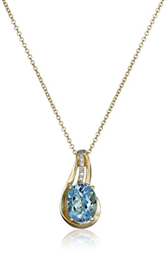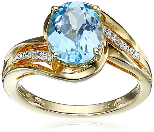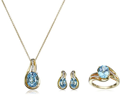 Three-piece gold-plated pendant necklace, studs, and ring set each featuring diamond insets and faceted blue topaz in four-prong settings
