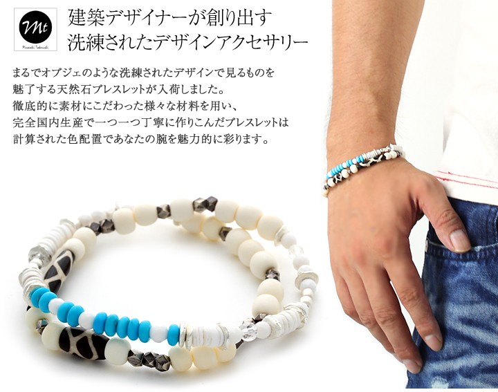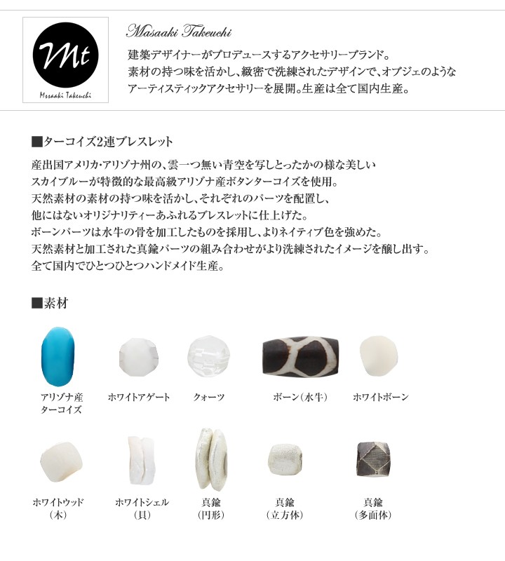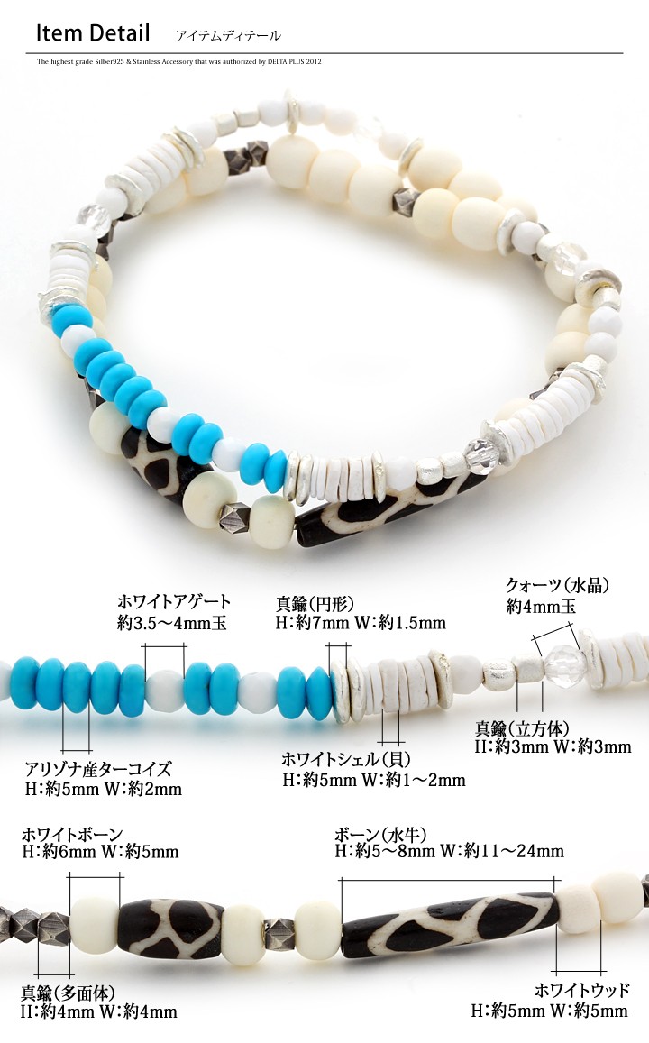 【ターコイズ】身につけることで、揺るぎない信念を貫き、夢や目標を達成させるパワーストーンともいわれているのです。 非常に明るいエネルギーをもち、ネガティブなエネルギーを払いのけ、困難を乗り越えて願望を達成するためのサポートをしてくれます。 勇気と行動力をもたらし、はつらつとした積極性を与えてくれますので、新しいことに対して臆病になってしまう人には、 大切な一歩を踏み出す力を貸してくれるでしょう。さらに、この石は『友情の石』。人にプレゼントし、されることにより、 心と心をつなぐ絆をよりいっそう深め、パワーアップさせる石ともいわれています。 【水晶】 水晶のパワーは、『調和・統合・強 化』。そして非常に優れた浄化作用をもたらす石として知られています。心身の活性化や潜在能力の開花、直観力や想像力の強化などにも力を貸してくれます。 まさに、パワーストーンのなかでも特に、万能的な存在です。【ホワイトアゲート】長寿や富・健康・家内安全など一般的なお守りと同じ効果のあるパワーストーンです。とくにホワイト色は、迷いがある場合や、物事を清算したい時に持つと良いでしょう。