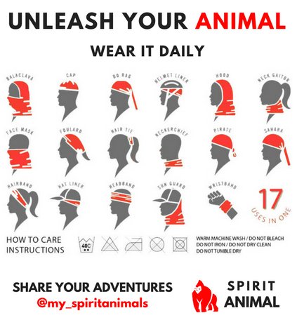 - WHY CHOOSE SPIRIT ANIMAL?---100% MONEY BACK GUARANTEE We truly believe in this product and use it daily. All of our headwear is vigorously tested to stand up to wind, water, sun, and stains. New animals are being created every week! Click "ADD TO CART" and Buy Now!